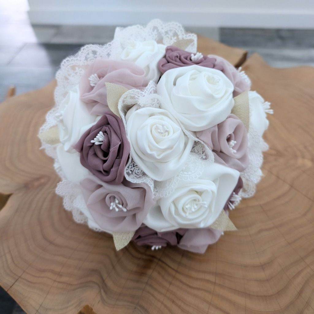 Bouquet de mariée mauve /parme et ivoire Bouquet de mariage accessoires Bouquet de mariée original satin ivoire et parme, tulle Créatrice fleur en tissu Bouquet de mariée sans fleurs Création fleurs de mariée
