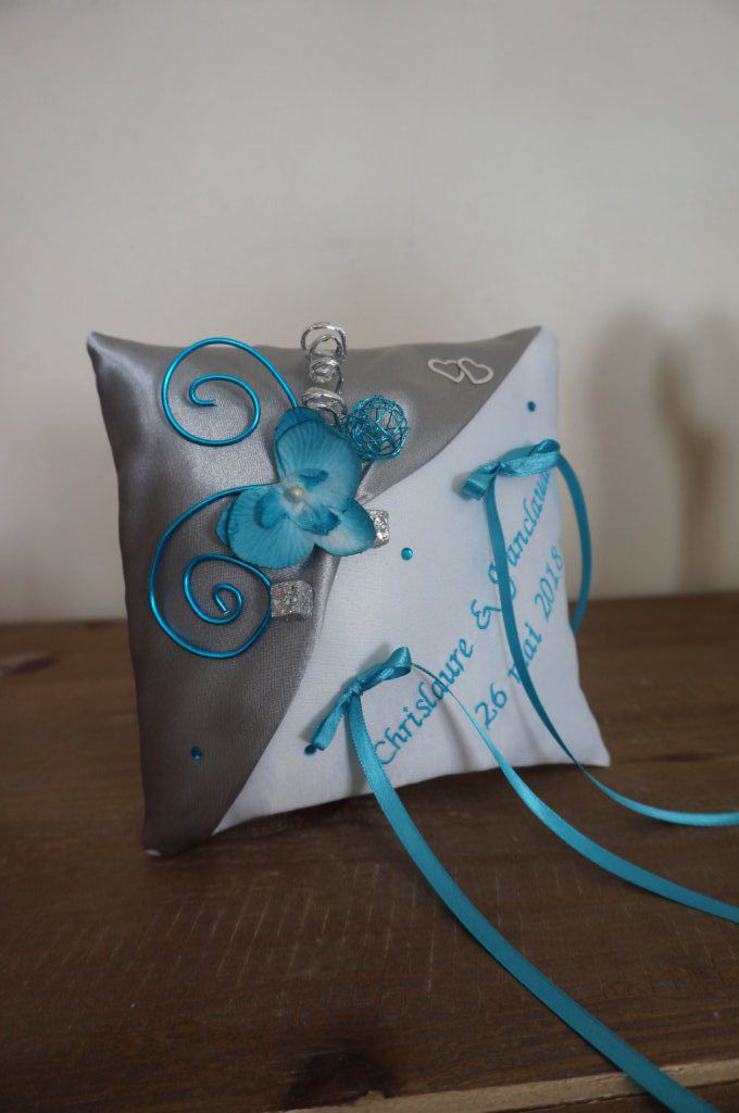 Ref 15 L Coussin porte alliance plage turquoise et or Porte alliance mariage turquoise ivoire Coussin 19x19cm broderie et coquillages 39€