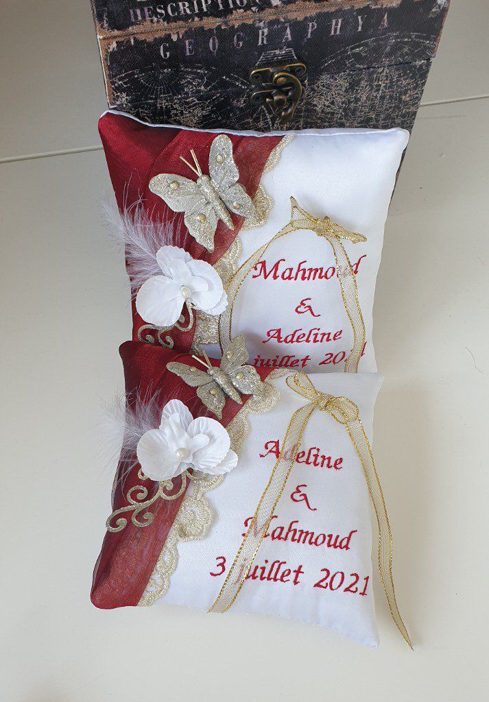 Ref 13W Coussin d'alliance bordeaux et or Porte alliance mariage bordeaux Base ivoire et dentelle Broderie droite coussin 39€