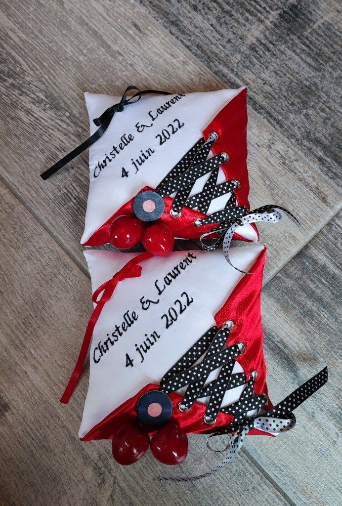 ref 104 Coussin d’alliance forme bonbon Porte alliance gourmandise couleur fraise et chocolat broderie + decor 45€